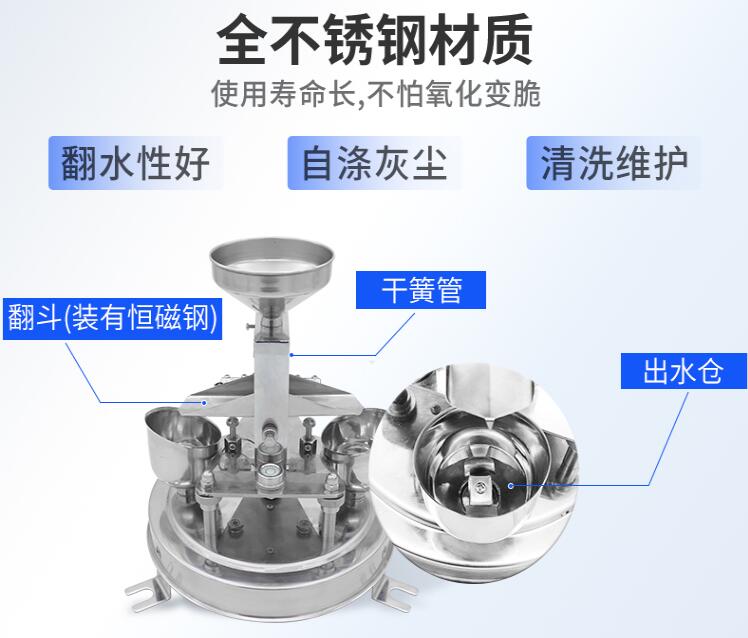 翻斗式雨量計(jì)是由感應(yīng)器及信號(hào)記錄器組成的遙測雨量儀器,感應(yīng)器由承水器、上翻斗、計(jì)量翻斗、計(jì)數(shù)翻斗、干簧開關(guān)等構(gòu)成;記錄器由計(jì)數(shù)器、錄筆、自記鐘、控制線路板等構(gòu)成。翻斗是用工程塑料注射成型的用中間隔板分成兩個(gè)等容積的半錐斗室。它是一個(gè)機(jī)械雙穩(wěn)態(tài)結(jié)構(gòu),當(dāng)一個(gè)斗室接水時(shí),另一個(gè)斗室處于等待狀態(tài)。降雨時(shí),承水口收集的雨水,經(jīng)過漏斗注入計(jì)量翻斗。當(dāng)所接雨水容積達(dá)到預(yù)定值 0.2mm時(shí),由于重力作用使斗室自己翻倒,處于等待狀態(tài),另一個(gè)斗室處于接水工作狀態(tài)。當(dāng)其接水量達(dá)到預(yù)定值時(shí),使斗又自己翻倒,處于等待狀態(tài)。在翻斗側(cè)壁上裝有磁鋼,它隨翻斗翻動(dòng)時(shí)從干式舌簧管旁掃描,使干式舌簧管通斷。即翻斗每翻倒一次,干式舌簧管便接通一次送出一個(gè)脈沖信號(hào)——這就是脈沖型翻斗式雨量計(jì)的工作原理。