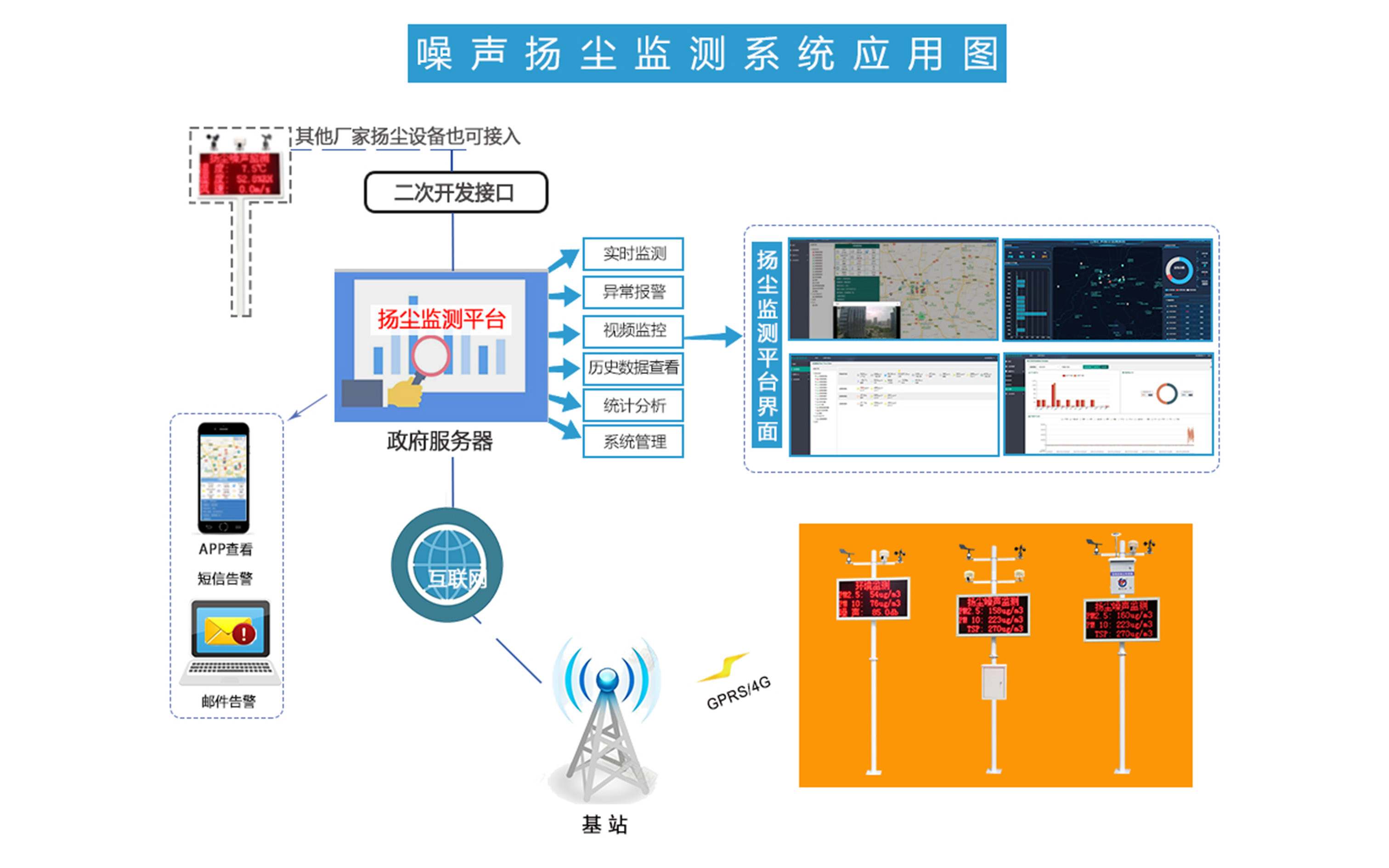 建大仁科揚塵監測系統由噪聲揚塵監測站、傳輸系統、監控軟件云平臺及噴淋系統(霧炮)組成,能夠對現場環境的PM2.5、PM10、環境溫濕度及風速、風向及風力監測、噪聲監測等10項要素的實時監測;通過GPRS/4G網絡傳輸到監控平臺,同時具備超限警報、智能聯動功能,實現自動監測控制。